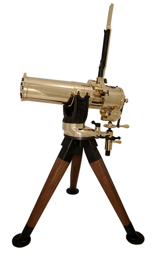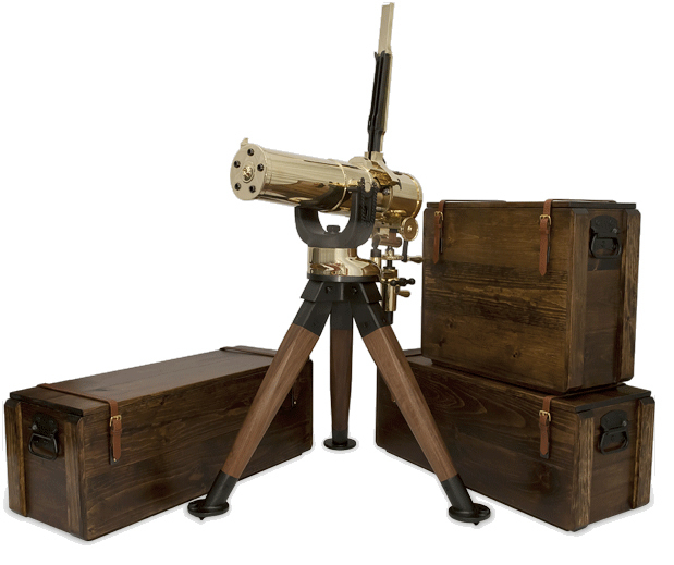 | Museum QualityFully OperationalBuilt To Original Size45-70 Government CaliberFires Up To 800 Rounds Per Minute | Five Fully Brass Encased Direct Drive BarrelsBeautiful Brass and Iron TripodWalnut Stained Hard Wood Tripod LegsV-Notch Rear Sight, Graduated To 1,000 YardsIncludes Deluxe Transit Chests, Tools and Accessories |